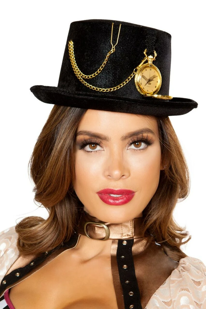 This top hat completes your favorite costume in sexy style. Whether it’s a steampunk ensemble, a mysterious stranger, or a fun clubwear outfit, this high-quality black hat is sure to steal the show. This classy hat features an affixed gold chain and pocket watch that adds to the authentic charm.