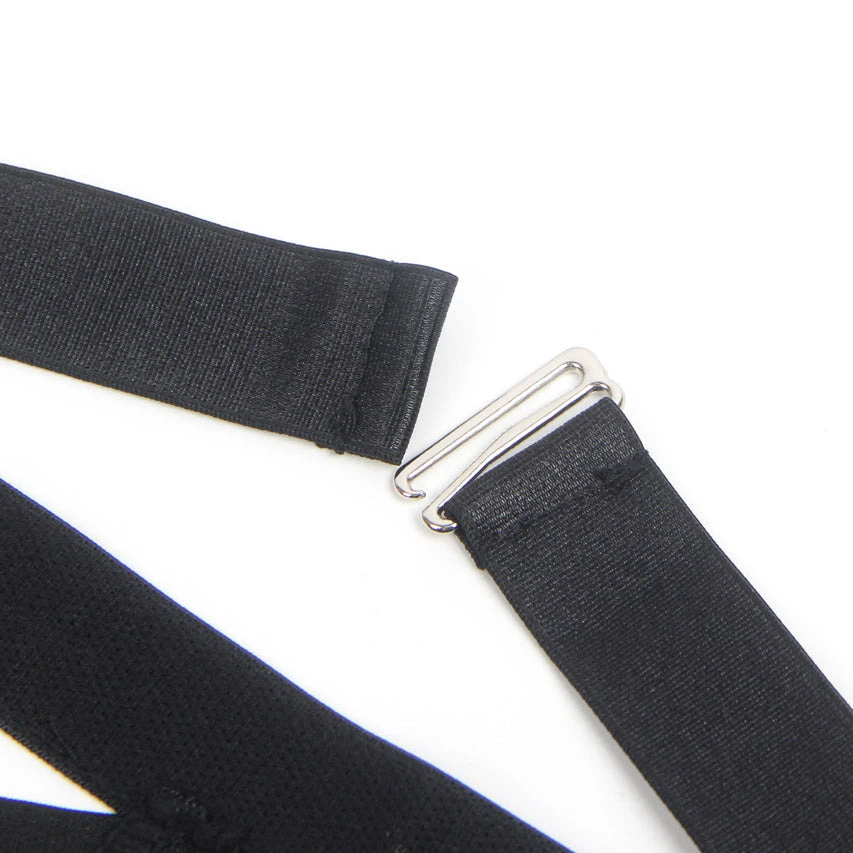 This bondage set includes a strappy cut bra with adjustable straps, panty, and a matching strappy garterbelt with adjustable garter straps. (Stockings not included.)