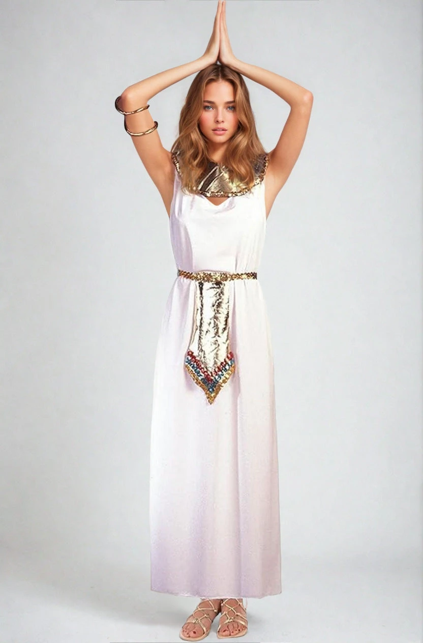 Transform into the regal and stunning Queen of the Nile with this Adult Cleopatra Costume. This Ancient Egyptian ensemble includes a white gown, a fancy gold lame belt adorned with sequins, and a headband – truly fit for a queen. This is the ultimate Halloween costume for any Cleopatra enthusiast – one size fits most adults!
