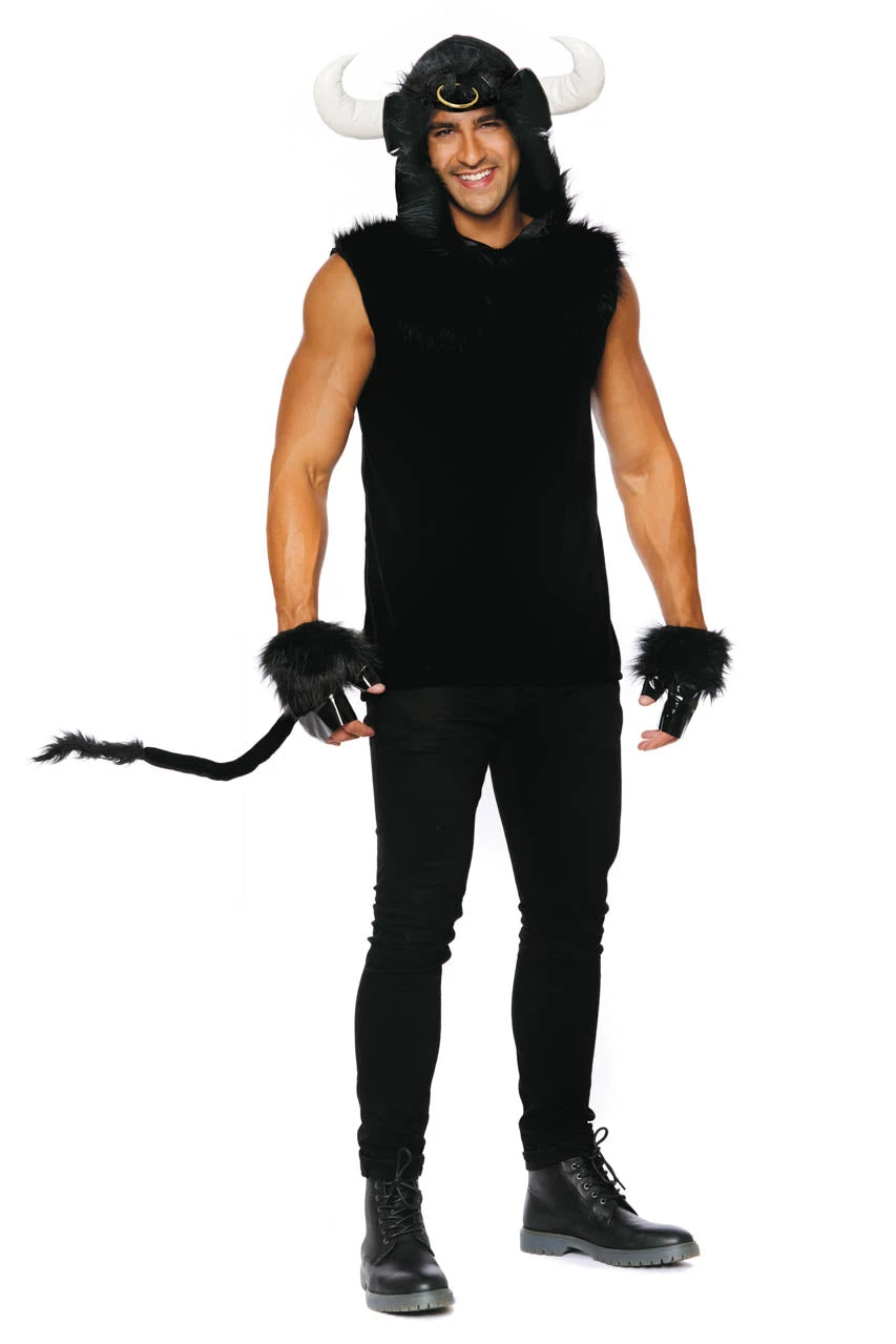 This Men’s Toro Bravo costume includes a black sleeveless shirt with attached faux fur hood, bull horns, pierced bull nose, tail, and gloves.