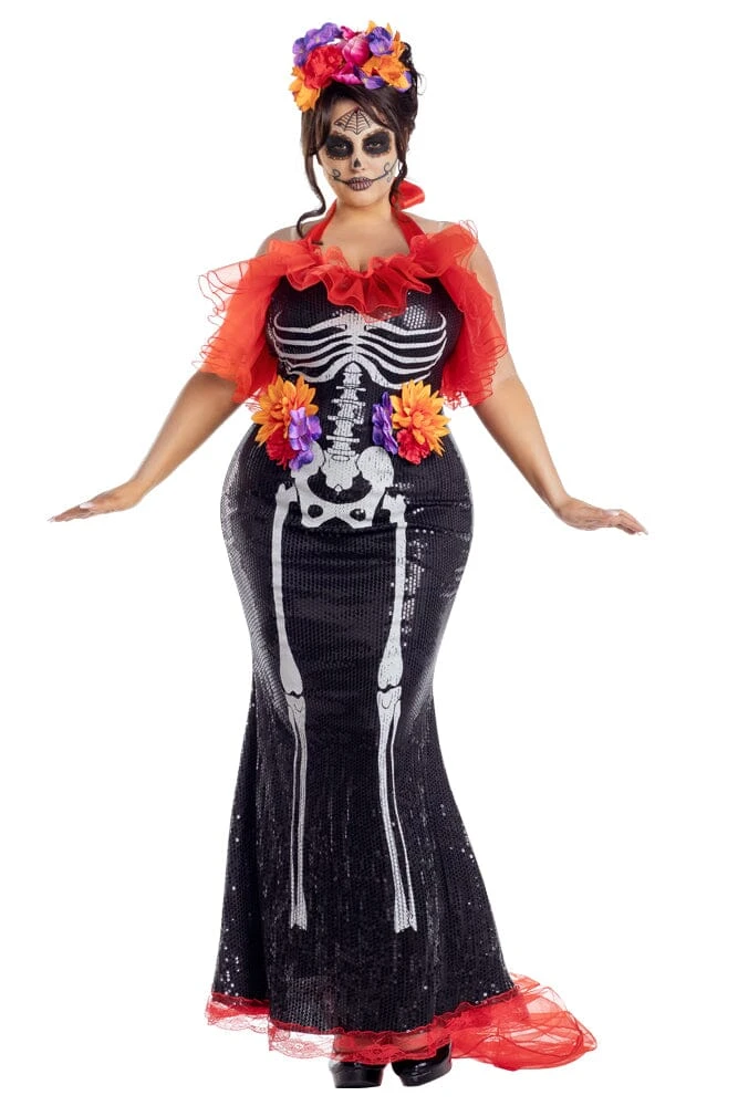 This plus size Glamour Muerta costume includes a black mermaid-style dress with skeleton print, red fruffle train, off the shoulder details, flower appliques, a neckpiece, and headpiece.