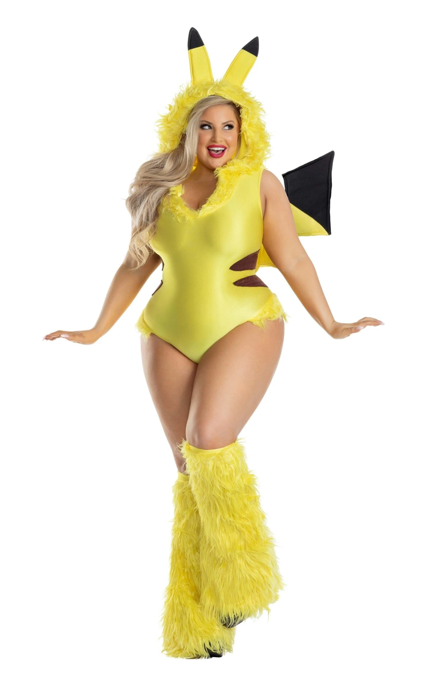 You gotta catch ’em all. This plus size Collectible Anime’ Cutie costume includes a yellow bodysuit with faux fur trim, brown stripe sides, attached tail, attached faux fur hood with attached ears and faux fur leg warmers. Get that Pikachu look this Halloween
