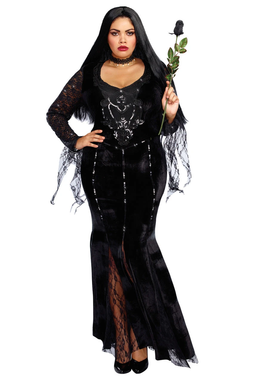 Be the queen of the night in this Plus Size Frightfully Beautiful costume featuring a long black gown with long sleeves, sheer mesh mermaid skirt bottom, intricate piping and a low cut bust. (Rose not included.)
