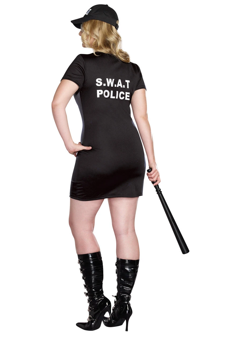 This plus size SWAT Police costume includes a black knit mini dress with a zip up front, “SWAT Police” print back, a police badge and matching hat. (Sunglasses and baton not included.)