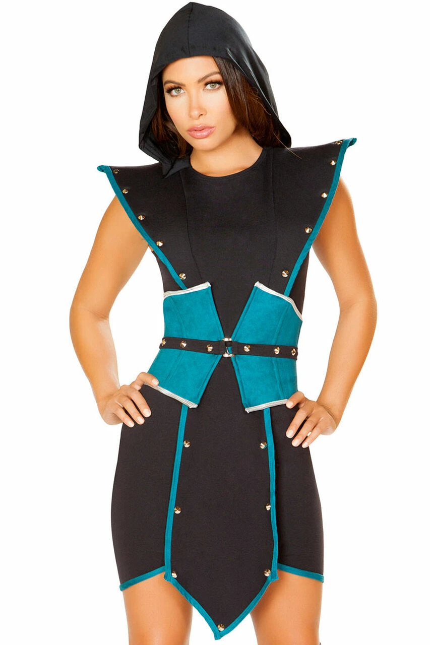 This Emperors Guard Sexy costume includes a black and blu dress with structured shoulders, studded details, studded belt, waist cincher, hood, and sheer mesh mask.Â