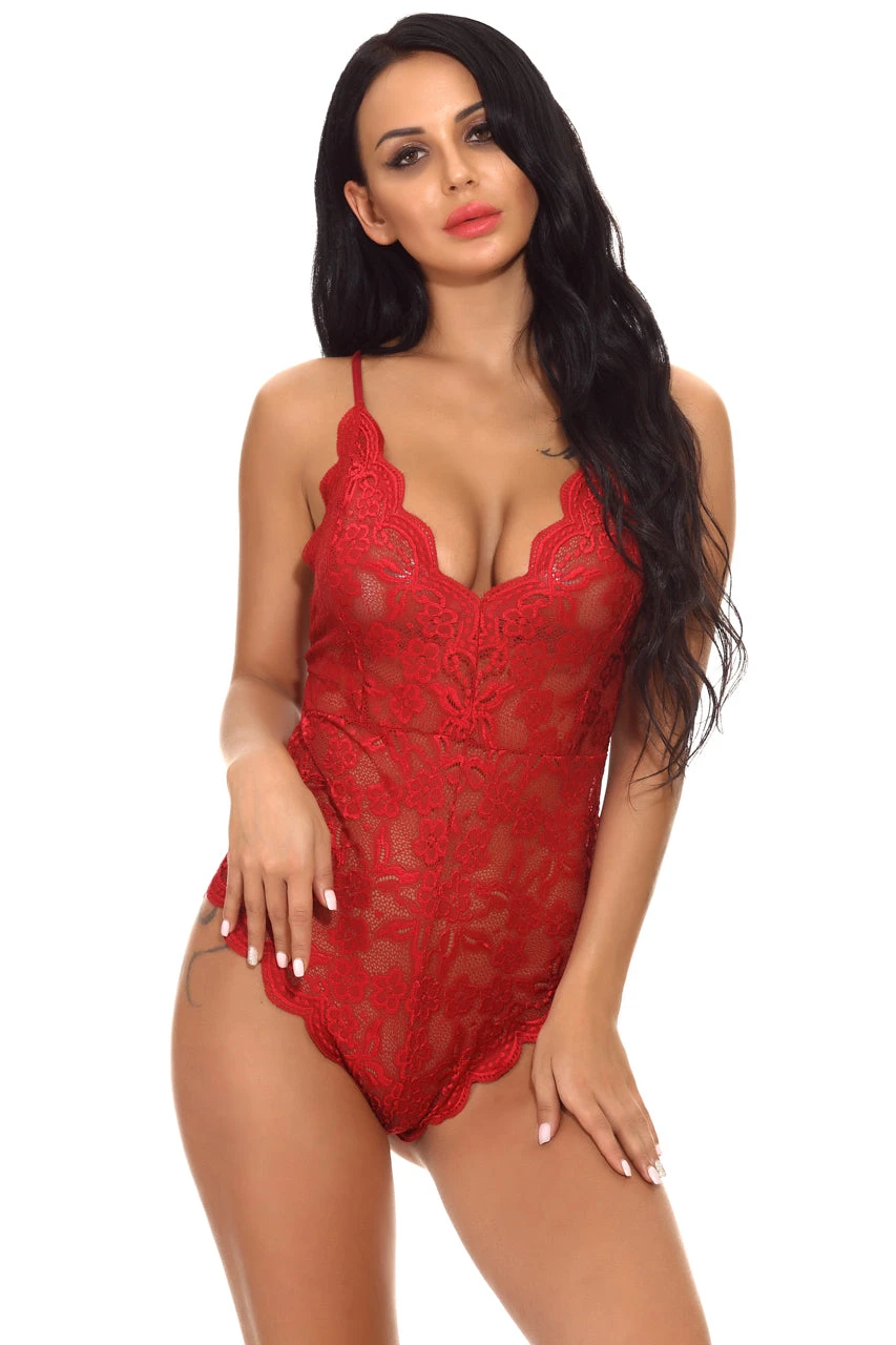 This rose red, floral lace teddy lingerie features a scalloped lace trim, a low cut bust, and criss cross back straps.