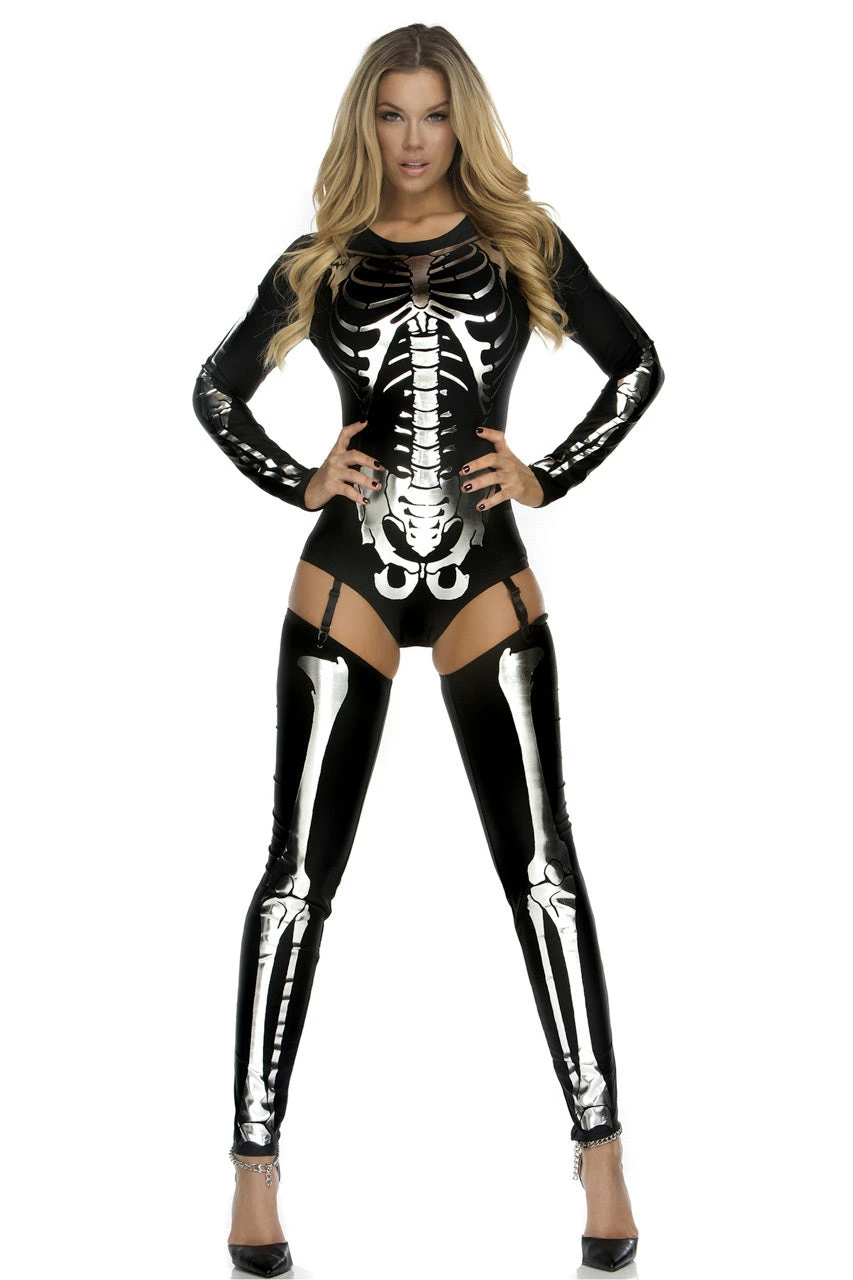 No bones about it. This Snazzy Skeleton costume includes a black bodysuit with a silver metallic skeleton print, long sleeves, attached garters and thigh high leggings with metallic silver bone print details.