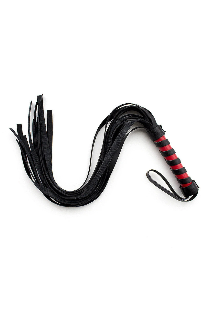 Have some fun with this black, faux leather flogger whip.