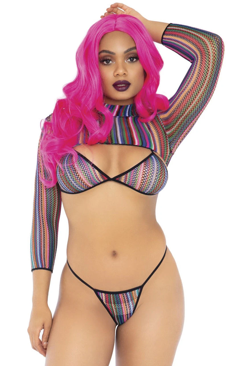 This three-piece lingerie set includes a colorful fishnet crop top with long sleeves, a triangle bikini top and matching thong.