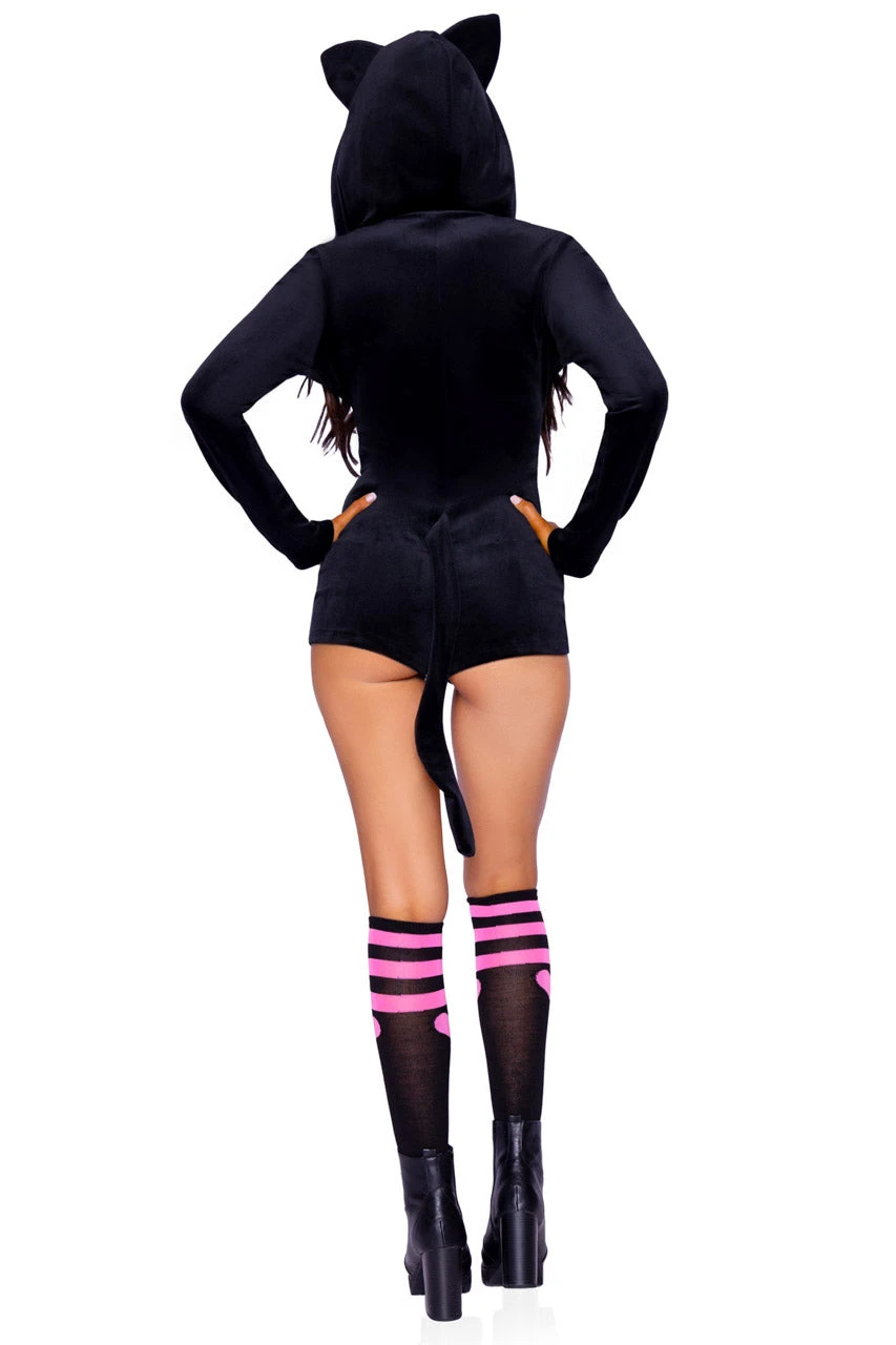 This Comfy Cat costume features a black, ultra-soft velvet romper with a zip up front with a bell zipper pull, attached hood with cat ears, long sleeves, and an attached tail.