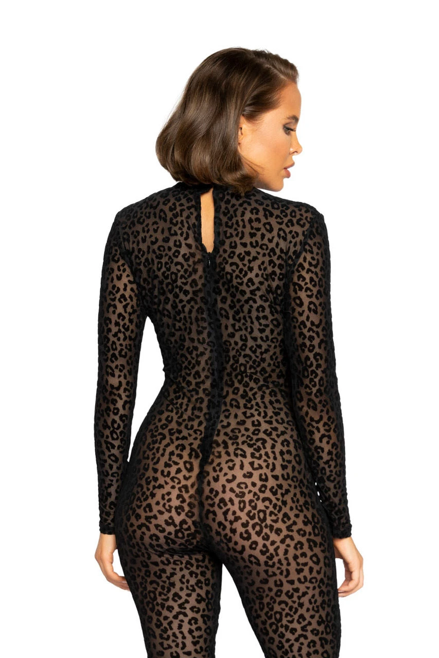 This unique, skin tight sheer bodysuit lingerie features and wild leopard print and fits securely with the zipper in the back.