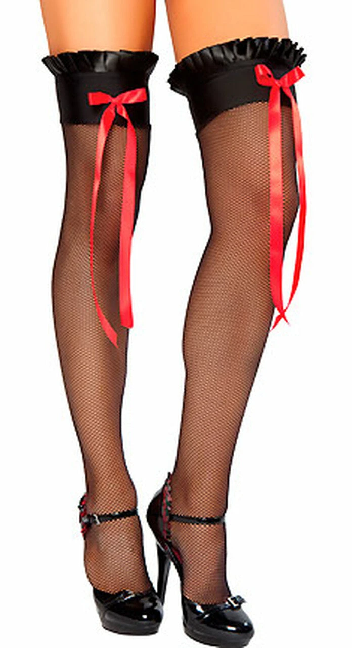 Thigh High Pleated Ruffle Top Fishnet Stockings with Ribbons and Back Seam.