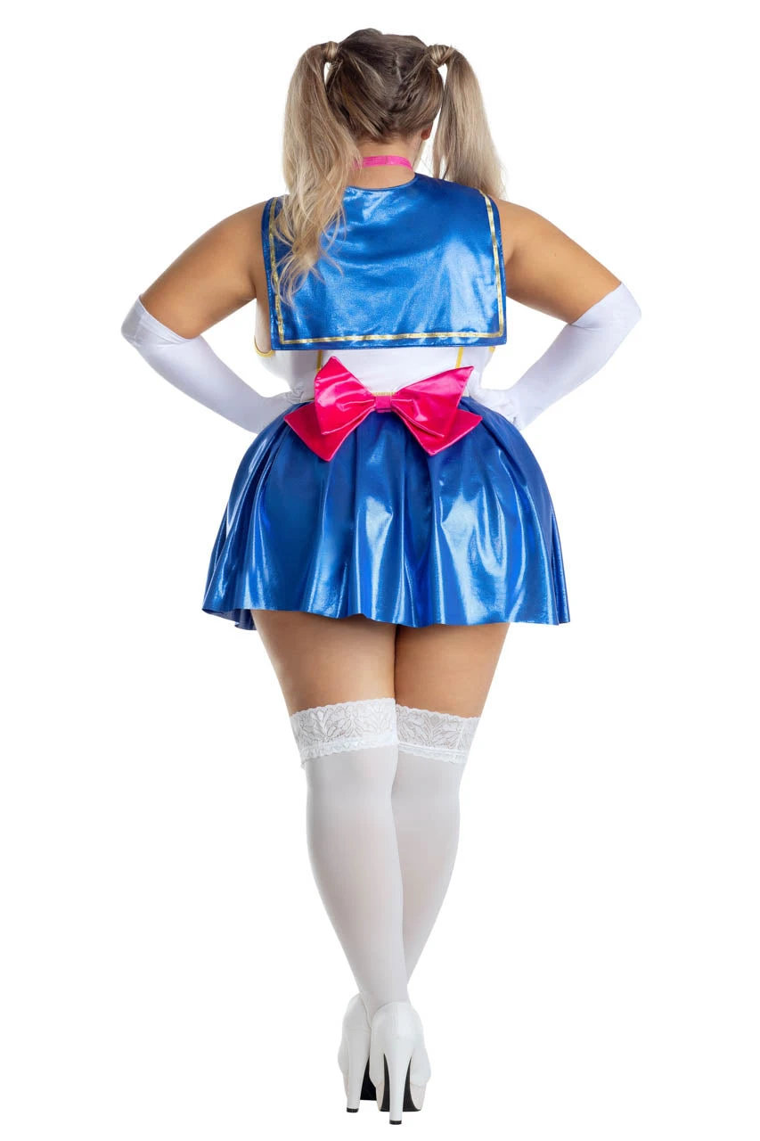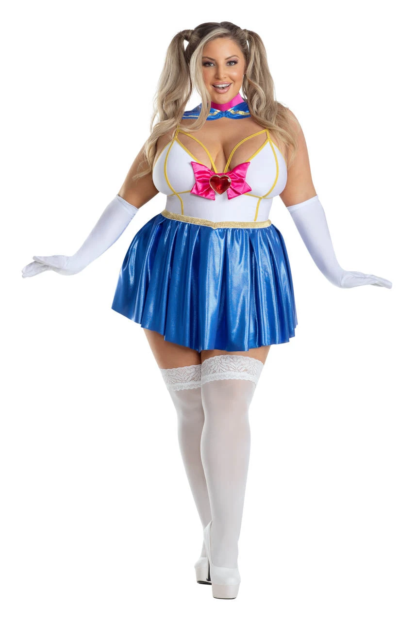 This plus size, Anime School Girl costume includes a white romper with gold trim detail, a sparkle sailor collar, blue pleated skirt , oversized pink bow and long gloves. (Stockings not included with Anime School Girl outfits.)