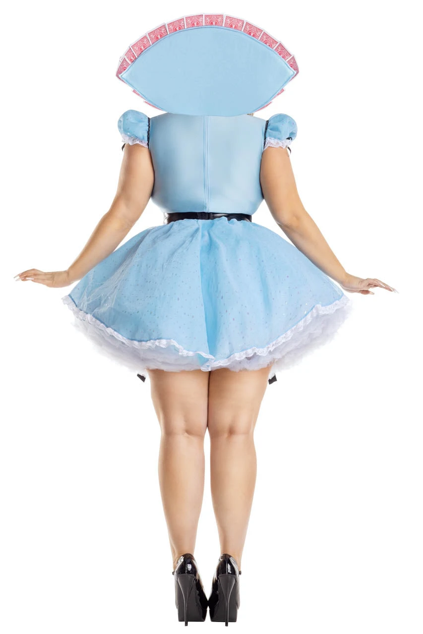 This plus size, Deck of Cards Alice costume includes a blue dress with sparkle organza accents, ribbon and sequin details, vinyl belt, hair bow, and removable playing card collar. (Petticoat not included.)