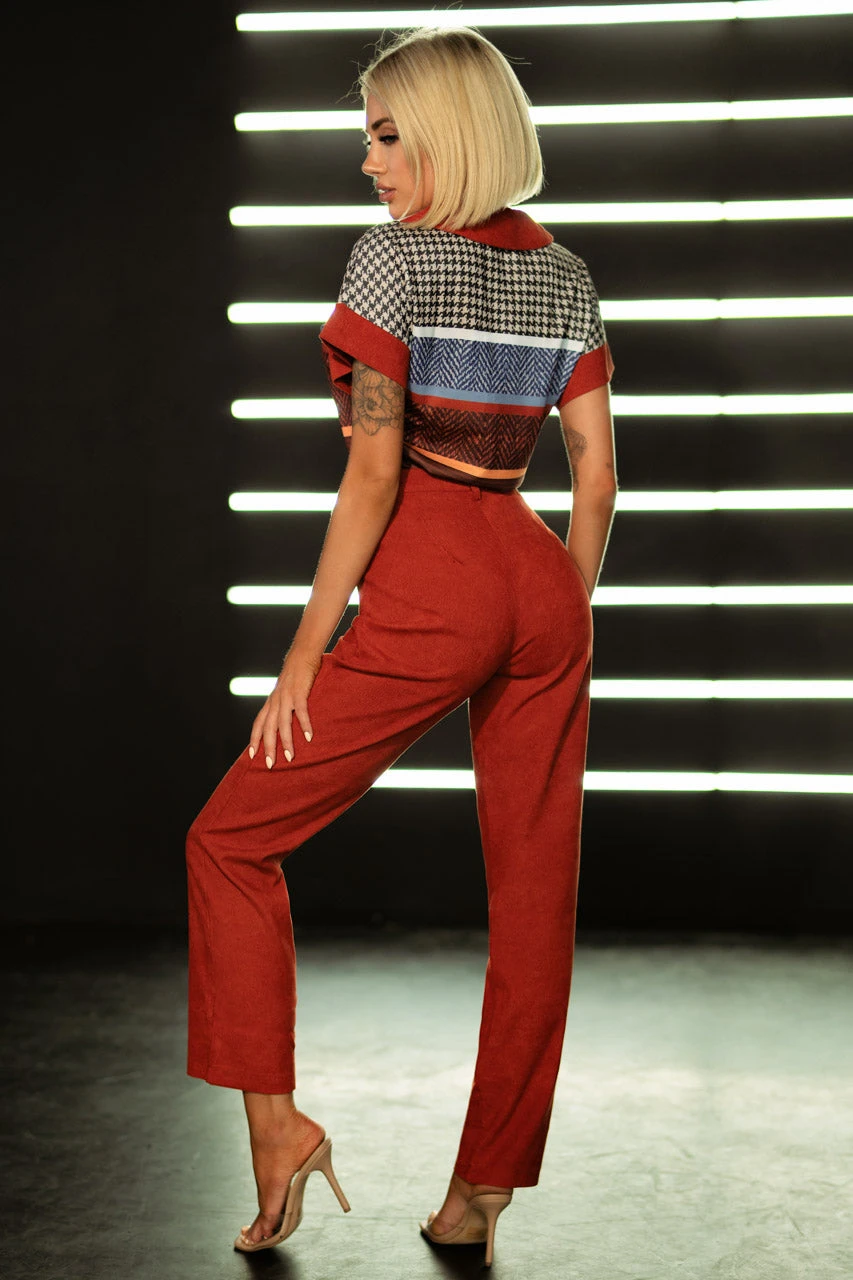 This plus size Music Video Pop Star costume includes a patterned, short sleeve top with a mini v-cut neck, and matching red pants.