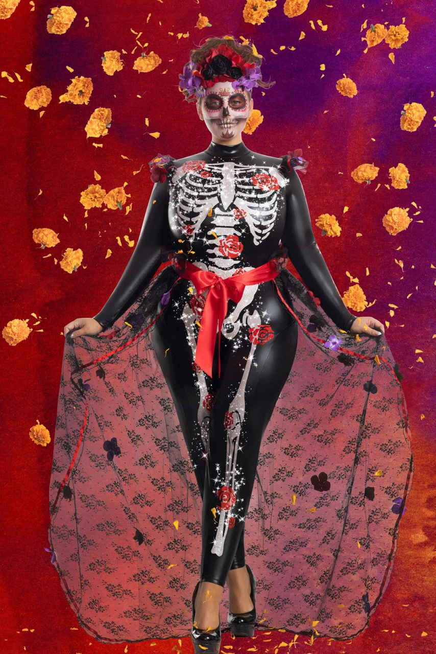 This plus size Rosas Day of the Dead costume includes a black catsuit with skull and flower print, lace shoulder details, a tie front lace bustle skirt and flower crown head piece.