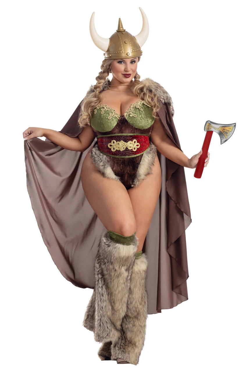 This plus size Valhalla Honey costume includes a velvet bodysuit with faux fur trim, gold appliques, belted midsection, a long brown cape with faux fur trim, boot covers and toy axe. (Headpiece not included.)