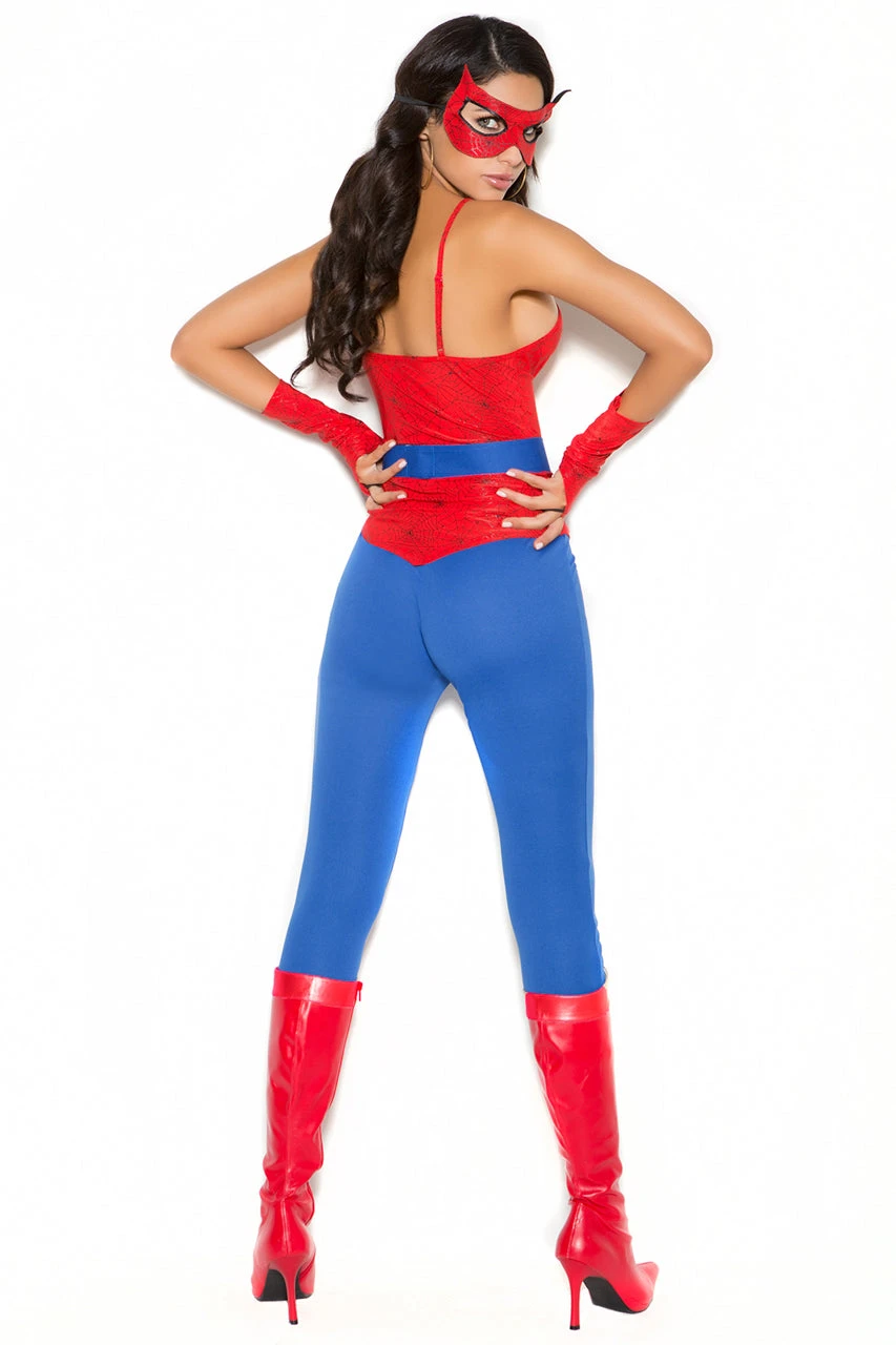 This five-piece, Spider Super Hero costume includes a spiderweb print cami top, blue belt, blue pants, mask, and fingerless gloves.